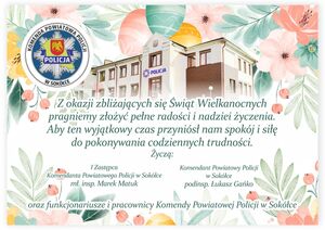 Z okazji Świąt Wielkanocnych Komendant Powiatowy Policji w Sokółce podinspektor Łukasz Gańko wraz z I Zastępcą Komendanta Powiatowego Policji w Sokółce młodszym inspektorem Markiem Matukiem oraz funkcjonariuszami i pracownikami sokólskiej komendy składają pełne radości i nadziei życzenia. Aby ten wyjątkowy czas przyniósł nam spokój i siłę do pokonywania codziennych trudności.