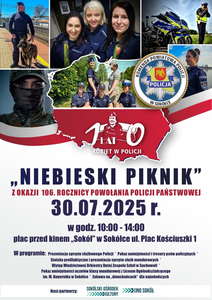 Zapraszamy na "NIEBIESKI PIKNIK" z okazji 106. rocznicy powołania Policji Państwowej. Festyn odbędzie się 30 lipca 2025 roku w godzinach 10.00-14.00, na placu przed Kinem "Sokół" ul. Plac Kościuszki 1 w Sokółce. Podczas pikniku zaprezentujemy sprzęt służbowy Policji oraz pokaz umiejętności policyjnych psów służbowych. Będzie można odwiedzić również stoiska profilaktyczne innych służb mundurowych i zobaczyć występ Młodzieżowej Orkiestry Dętej Zespołu Szkół w Suchowoli, pokaz umiejętności uczniów klasy mundurowej z Liceum Ogólnokształcącego im. M. Kopernika w Sokółce. Na najmłodszych czekać będą "dmuchańce". Serdecznie zapraszamy!