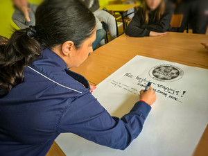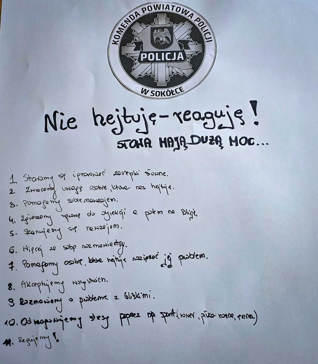 Sokólskie policjantki i uczniowie Oddziału o Profilu Mundurowym z Zespołu Szkół w Dąbrowie Białostockiej połączyli siły, by głośno powiedzieć „stop hejtowi”. Funkcjonariuszki przypomniały młodzieży czym jest zjawisko hejtu. Uczestnicy rozmawiali o sposobach reagowania na agresję słowną w sieci i w środowisku szkolnym, a także o tym, gdzie szukać pomocy w sytuacjach trudnych. W części warsztatowej wspólnie przygotowano plakat zatytułowany „Nie hejtuje – reaguję! Słowa mają dużą moc…”. Młodzież umieściła na nim zasady, którymi powinna kierować się każda osoba chcąca przeciwdziałać hejtowi. Praca nad plakatem była okazją do wymiany doświadczeń i refleksji nad wpływem słów na innych. Warsztaty zakończyły się podsumowaniem oraz zachętą do dalszej współpracy młodzieży z policją w działaniach profilaktycznych.