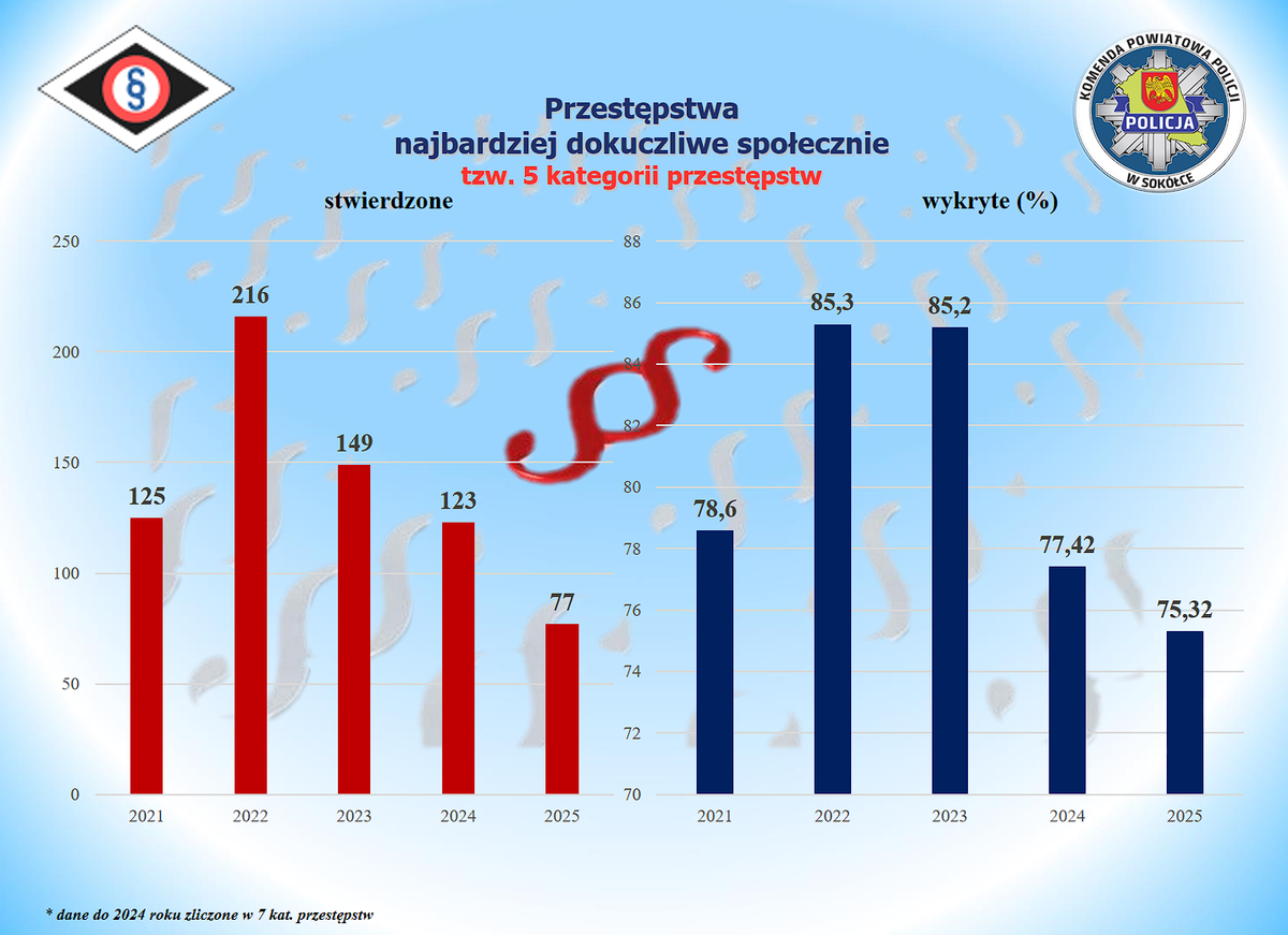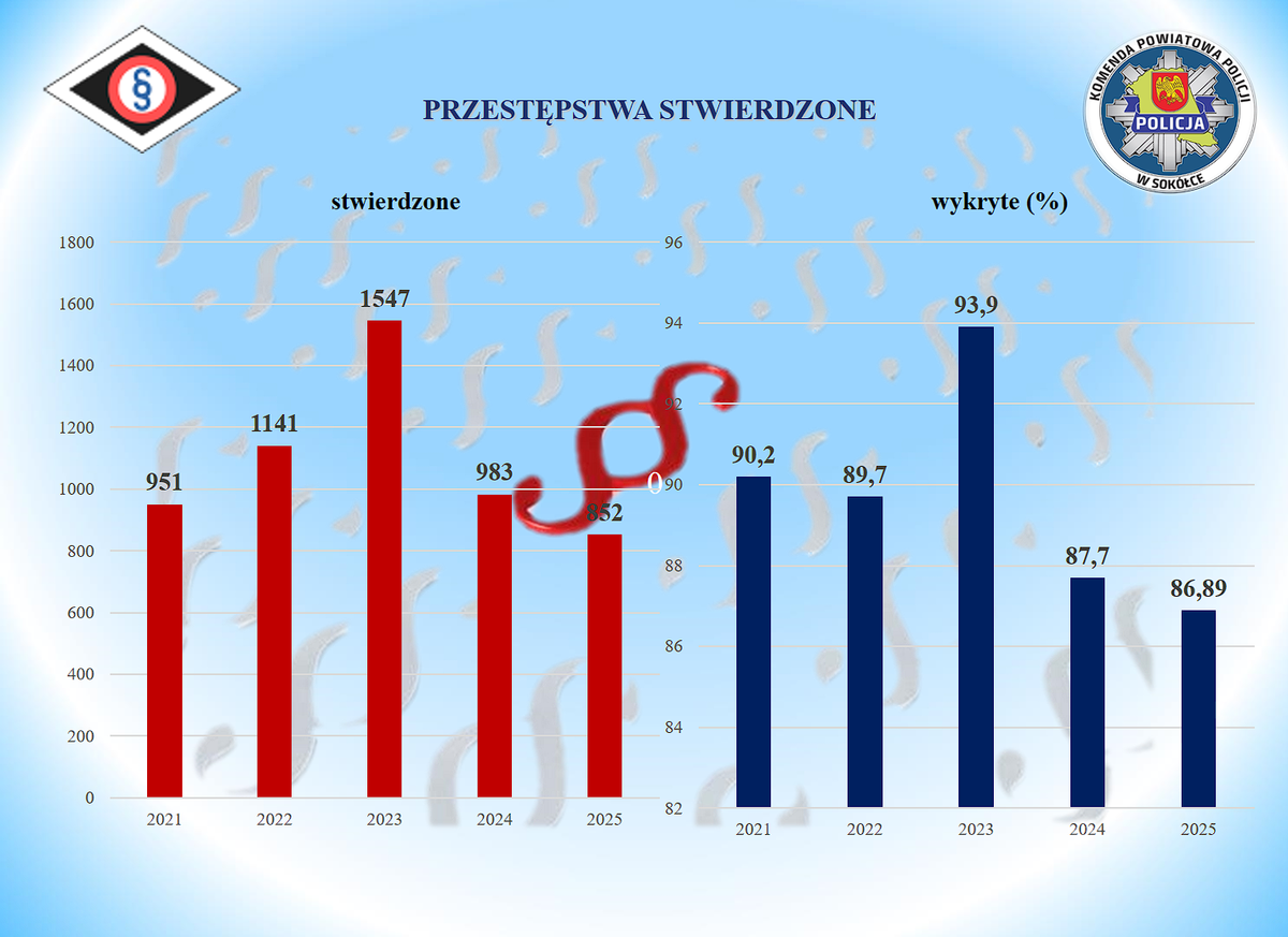 W 2025 roku, na terenie powiatu sokólskiego wskaźnik wykrywalności ogółem wyniósł 86,89% i zapewnił sokólskiej jednostce 2 miejsce na tle województwa. Mundurowi odnotowali w minionych 12 miesiącach: 543 przestępstw kryminalnych, 162 przestępstw drogowych, 110 przestępstw narkotykowych i 29 gospodarczych. Sokólscy śledczy mogą pochwalić się wysoką skutecznością wykrywania przestępczości kryminalnej, która kształtuje się na poziomie 88,05%. Zapewniło to jednostce I miejsce w województwie. W kategorii 5 przestępstw najbardziej uciążliwych społecznie wskaźnik wykrywalności wyniósł 75,32%, a policjanci odnotowali 77 przestępstw w tych kategoriach (o 46 mniej niż w roku 2024). Funkcjonariusze w minionym roku zabezpieczyli również ponad 7,5 kilograma narkotyków.