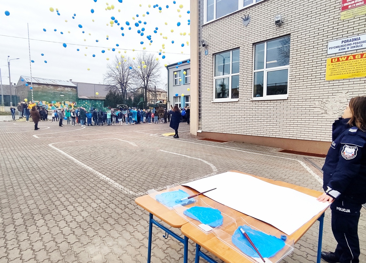 Policjantki z sokólskiej komendy wspólnie z uczniami z Zespołu Szkół Integracyjnych numer 2 w Sokółce włączyli się w obchody Światowego Dnia Autyzmu. Na znak solidarności z autystami powstał specjalny plakat. Funkcjonariuszki i dzieci za pomocą odcisków dłoni namalowały niebieskie motyle. Dodatkowo dzieci wypuściły w niebo również niebieskie balony, które symbolizują kontakt z innymi biorącymi udział w obchodach.