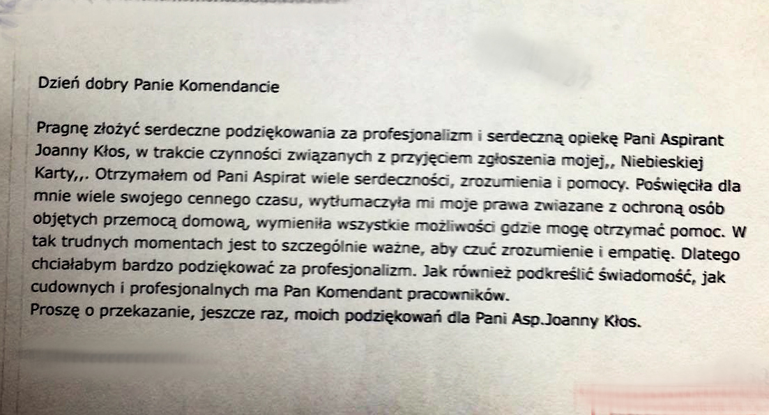 "Pragnę złożyć serdeczne podziękowania za profesjonalizm i serdeczną opiekę Pani aspirant Joanny Kłos..."- to fragment podziękowań skierowanych do dzielnicowej z Sokółki, która pomogła jednej z mieszkanek powiatu. W takich sytuacjach hasło "Pomagamy i Chronimy" nabiera szczególnego znaczenia, a podziękowania to dla policjantów najwyższy wyraz uznania za pomoc drugiemu człowiekowi.