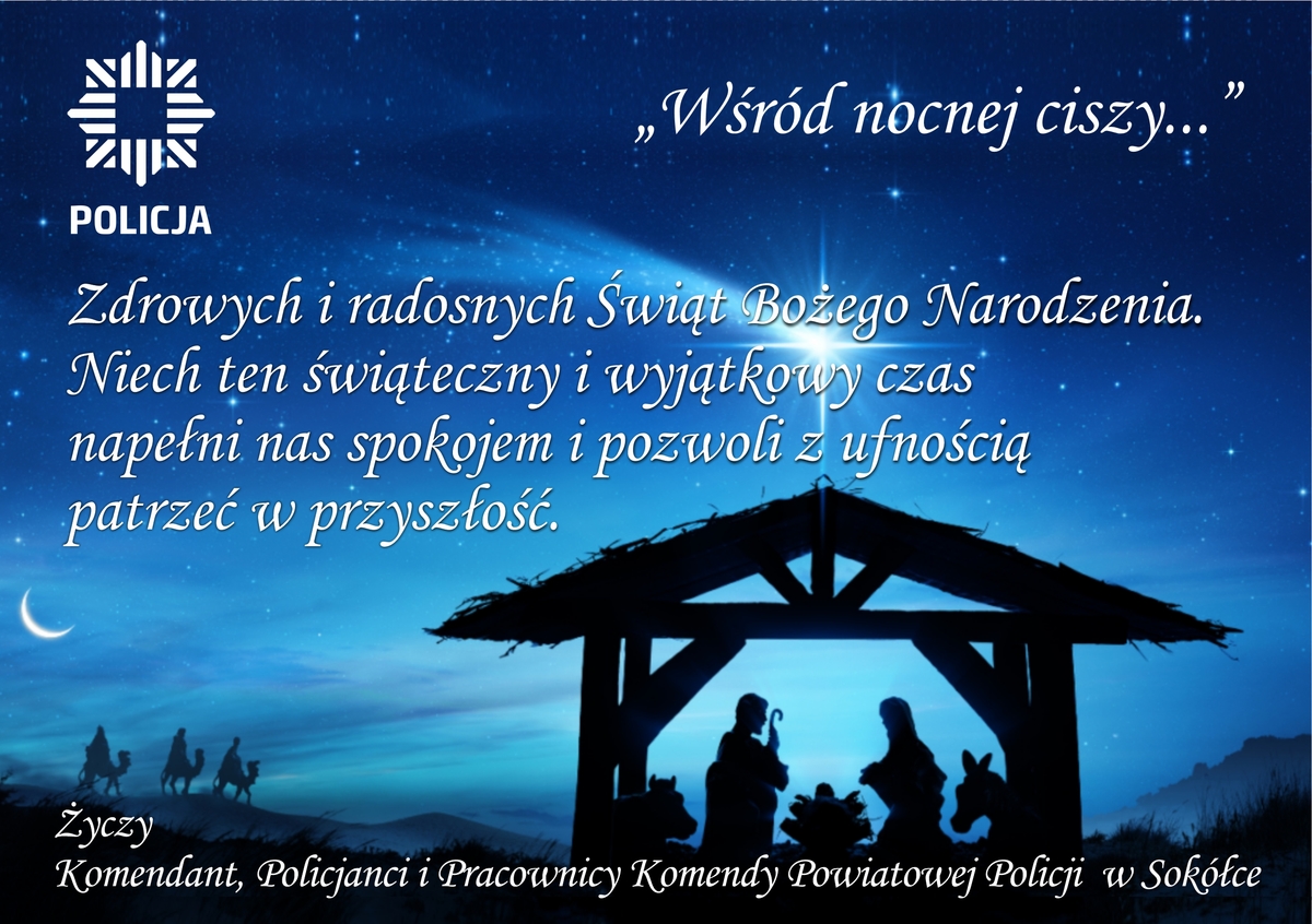 Z okazji nadchodzących Świąt Bożego Narodzenia p.o. Komendanta Powiatowego Policji w Sokółce młodszy inspektor Marcin Rymarski wraz z Zastępcą, Policjantami i Pracownikami Komendy Powiatowej Policji w Sokółce składają serdeczne życzenia zdrowych i radosnych Świąt Bożego Narodzenia. Niech ten świąteczny i wyjątkowy czas napełni nas spokojem, który pozwoli z ufnością patrzeć w przyszłość.